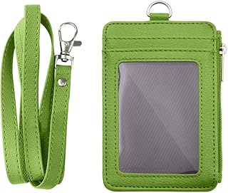GOGO Porte-badge professionnel avec fermeture éclair, 2 côtés verticaux en cuir PU avec poche zippée et cordon tour de cou en cuir - Vert
