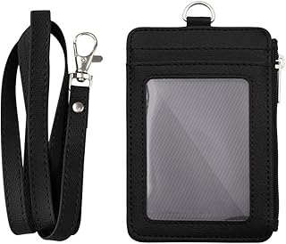 GOGO Porte-badge professionnel avec fermeture éclair, 2 côtés verticaux en cuir PU avec poche zippée et cordon tour de cou en cuir - Noir